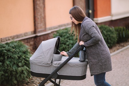 Attractive young mother walking with her little baby. Mom with newborn baby in pram