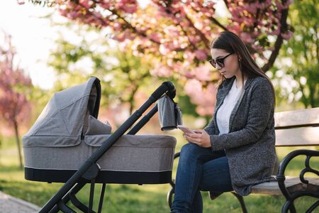 Young mom sitting on the bench with her baby in stroller and use phone. Mothe look something in internet