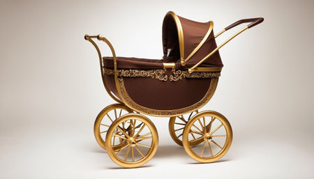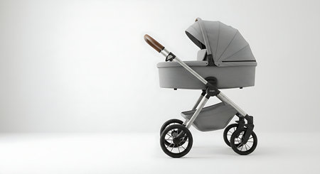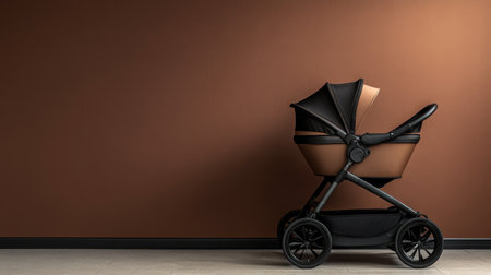 A modern baby stroller stands elegantly against a minimalist brown wall, showcasing a blend of style and functionality for contemporary parenting needs.