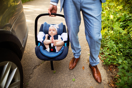 Baby in infant car seat on blue studio background. Carrier for transporting newborn babies in a chair