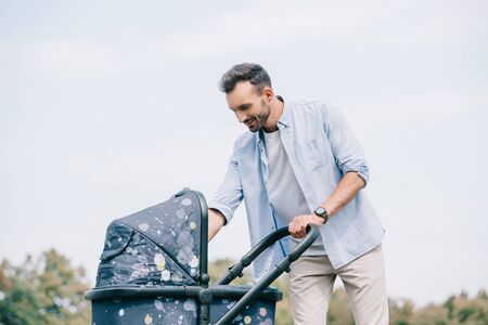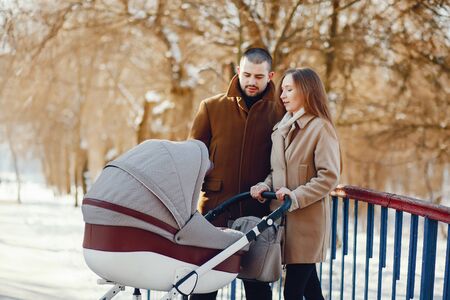 A bearded dad walking with baby carriage in winter park. A man with a baby stroller walks in a winter snow-covered city park in the cold. Caring father admires baby sleeping in stroller