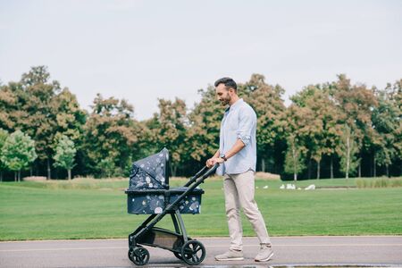 family, child and parenthood concept - happy mother walking with baby stroller in park.