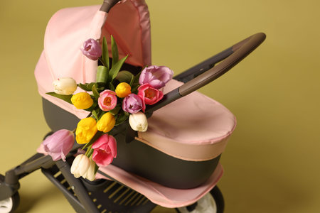 Stylish doll stroller and tulips on olive background. Kid's toy