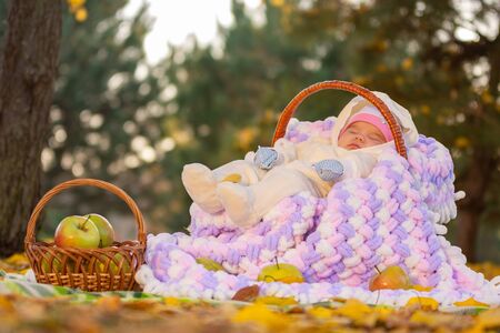 The baby sleeps in a basket in the autumn forest, next to a basket of apples