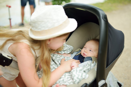 Cute big sister admiring her baby brother. Adorable girl holding her new baby boy brother. Kids with large age gap. Big age difference between siblings. Big family.