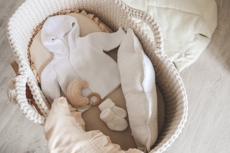 Outfit for a newborn in a baby cradle, concept in anticipation.