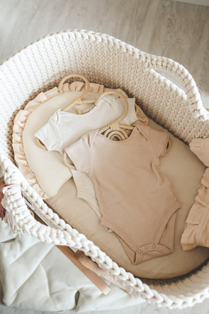 Two neutral bodysuits in a baby cradle, baby clothes.