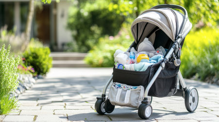 A well-equipped baby stroller parked on a sunny garden path, surrounded by vibrant greenery. Perfect for showcasing outdoor parenting moments.
