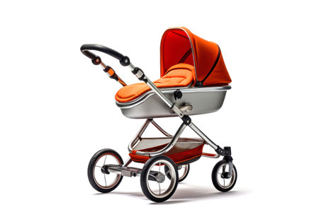 A vintage doll dressed in a bonnet lies peacefully in an orange pram. The pram is situated against a white wall, adding to the nostalgic charm of the indoor environment
