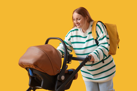 rear view of woman in yellow raincoat and with baby stroller by the sea