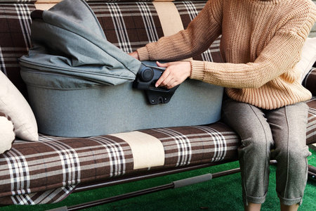 Mother changing her baby diaper in a stroller. Parenting, baby care, and motherhood on the go concept
