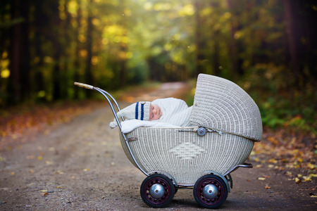 Little newborn baby boy, sleeping in old retro stroller in forest, autumn time, wrapped in scarf and knitted hat. Posed baby in retro pram, infant sleeping in vintage stroller in the woods
