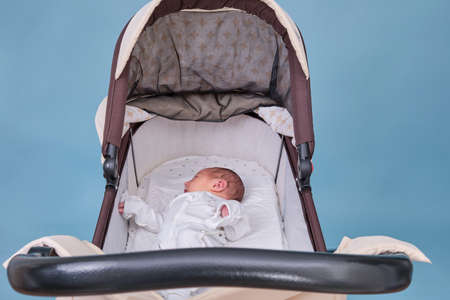 Baby boy in a stroller on a blue background. A child in white clothes in only diapers is lying in a stroller, studio shot
