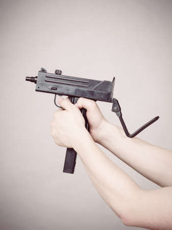 Unrecognizable man holding weapon, black machine gun on gray background. Dangerous military objects concept.