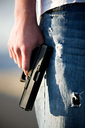 Teen male holding modern 9mm handgun, limited depth of field closeup