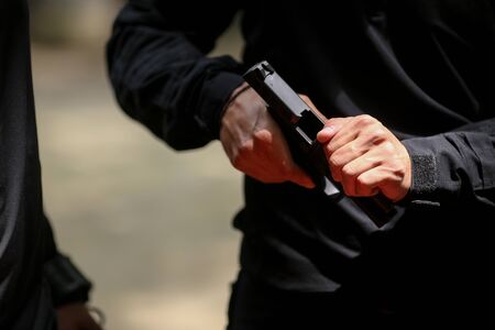 A gun in the hands of a young man, selective focus. Reloading weapons. Shooting training. Rules for keeping and carrying firearms. Background with copy space
