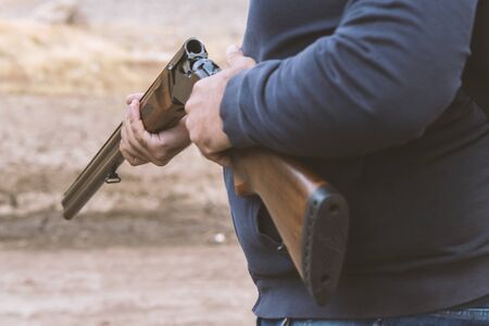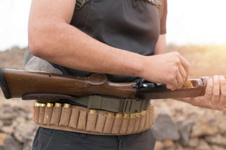 Close up of an unrecognizable hunter, loading shotgun, holds a shotgun and ammunition in his hand.
