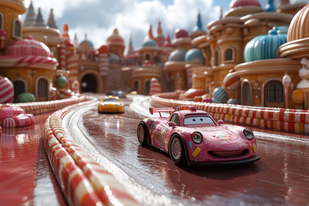 Scale model cars speed around a winding track filled with colorful buildings and playful decorations, showcasing a lively and intricate design that captures the joy of racing.