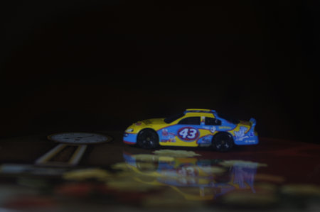 A realistic toy race car on a model racetrack, with dramatic lighting creating a competitive atmosphere