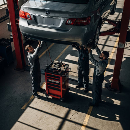 Professional mechanic working under a car placed on a hydraulic lift, adjusting and tightening bolts with precision in a modern auto repair shop