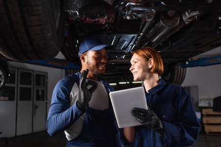 Smiling african american mechanic showing ok gesture near colleague with digital tablet under car in service