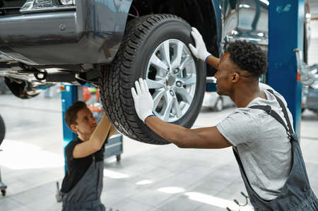 Two male workers fixes wheel, car service
