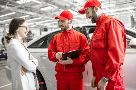 Young woman client with auto mechanics in red uniform standing with some documents at the car service