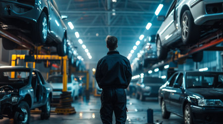 Mechanic gazes at elevated cars in a bustling workshop.