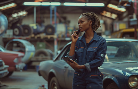 female mechanic in navy blue coveralls, holding clipboards, talking on the phone at workshop