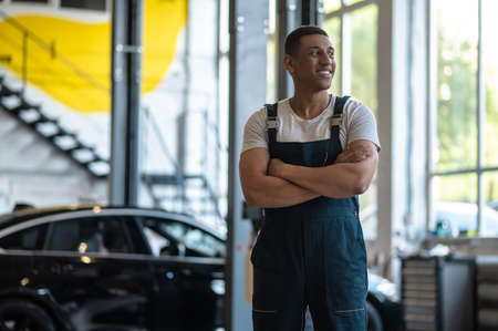 Smiling pleased automotive technician in the workplace