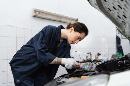 Waist up portrait of young female mechanic checking oil level with dipstick while repairing car in workshop, copy space