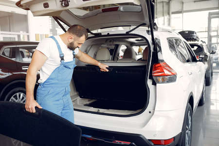 Mechanics checking and repairing the car in a blue suit. Car auto services concepts