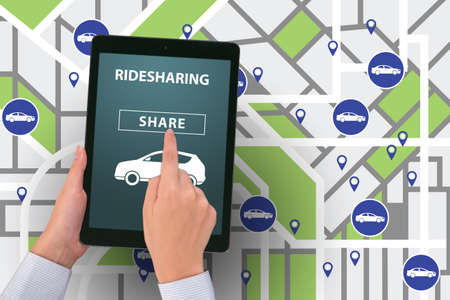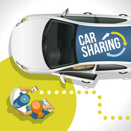 Car share parking lot and smartphone app for sharing. Using the car share app to unlock the car. 3D rendering image.