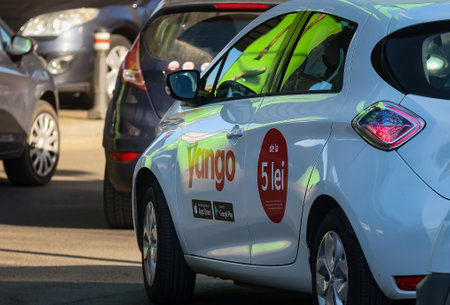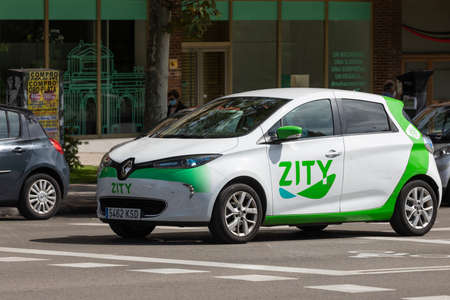 Madrid, Spain - Sep 26, 2020: A shared electric car, from the Zity company, Renault brand, is driven by someone in the Retiro district, central Madrid.