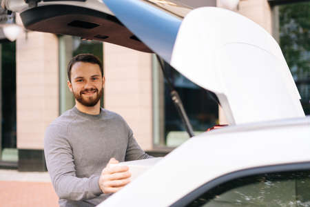 Close-up portrait of man standing near car looking at camera, large white box with beautiful red bow at truck. Handsome bearded young guy makes surprise for girlfriend or wife