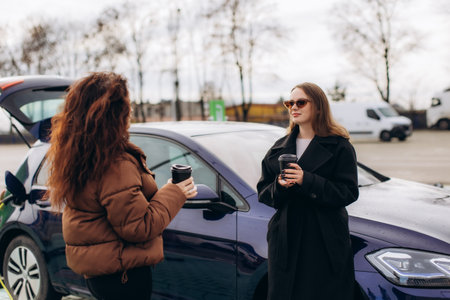 Friends talking and enjoying coffee together, waiting for electric vehicle to finish charging at an outdoor station
