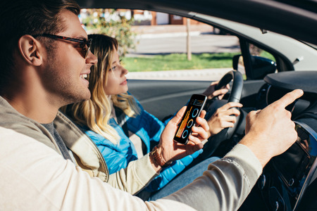 Man with smartphone showing direction to wife in car