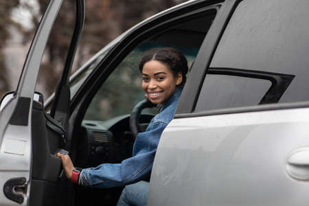 Auto blogger and test drive cars, good auto offer and ad. Smiling young african american lady driver sitting in car behind steering wheel, opens door and looks back at road in city, empty spaces
