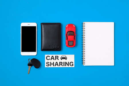 Car sharing concept. Composition with driver's license, blank paper, toy car, car key and text sign CAR SHARING on blue background. Top view. Taxi alternative, temporary car rental, sharing economy