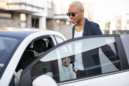 Latin man dressed in business wear opening his vehicle and sits on a driver seat at residential district. Man going by car from home to work