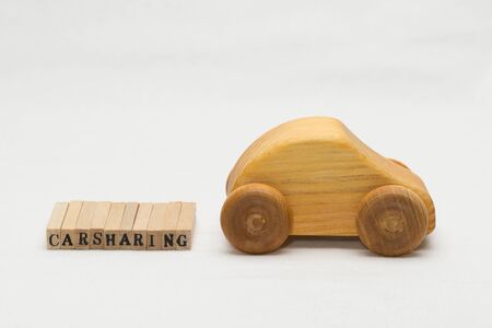Car sharing concept. Red toy car model and text sign CAR SHARING on colorful blue and yellow background. Auto dealership and rental, sharing economy, taxi alternative, ridesharing