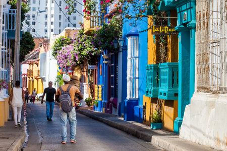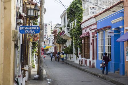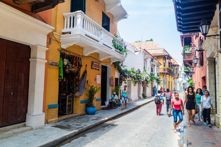 CARTAGENA, COLOMBIA - MAY 23: Unidentified people walk down the street among the colorful colonial buildings in Cartagena, Colombia on May 23, 2016.