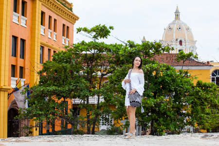 Beautiful woman walking around Cartagena de Indias next to the famous Clock Tower