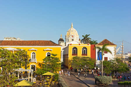Busy city square near the sea in Cartagena, Colombia. Cartagena old city before the sunset.