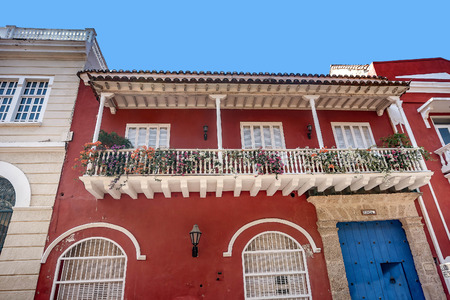 traditional facade with wood balconies and flowers at cartagena
