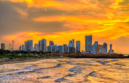 Skyline of Cartagena by the Caribbean Sea at sunset. Bolivar, Colombia