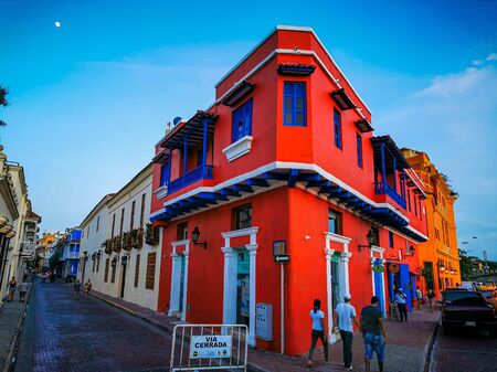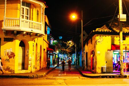 Cartagena de Indias, Colombia - 2019: Typical street scene in Cartagena at night, Colombia. Street with old historic colorful colonial houses