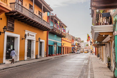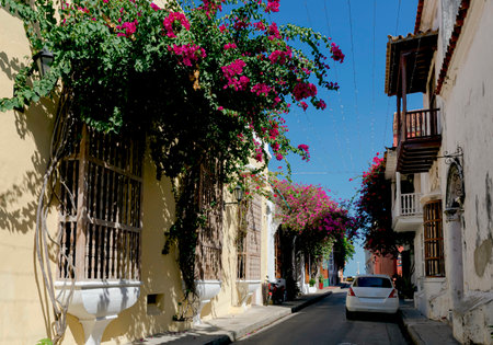 CARTAGENA, COLOMBIA - MARCH 4, 2023: Narrow street in the old town of Cartagena de Indias, Colombia
