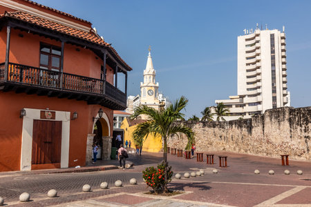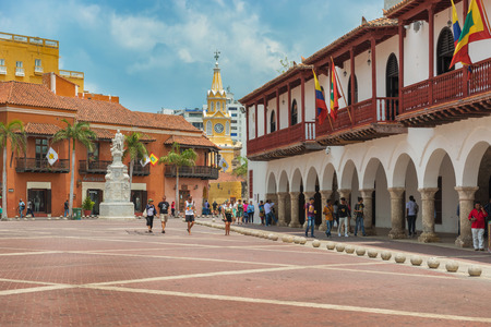 Cartagena, Colombia - March 24, 2017: Tourists walking by the old building with arches, located on Plaza de la Aduana and the clock tower gate at the background the entrance to historic part of Cartagena.