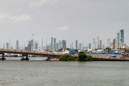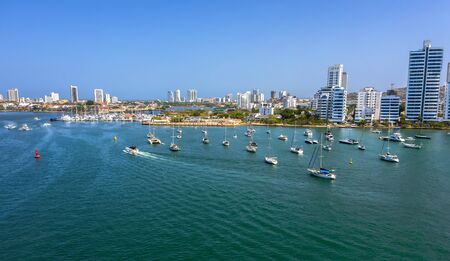 Beautiful view of the bay with yachts and modern buildings in Cartagena, Colombia.